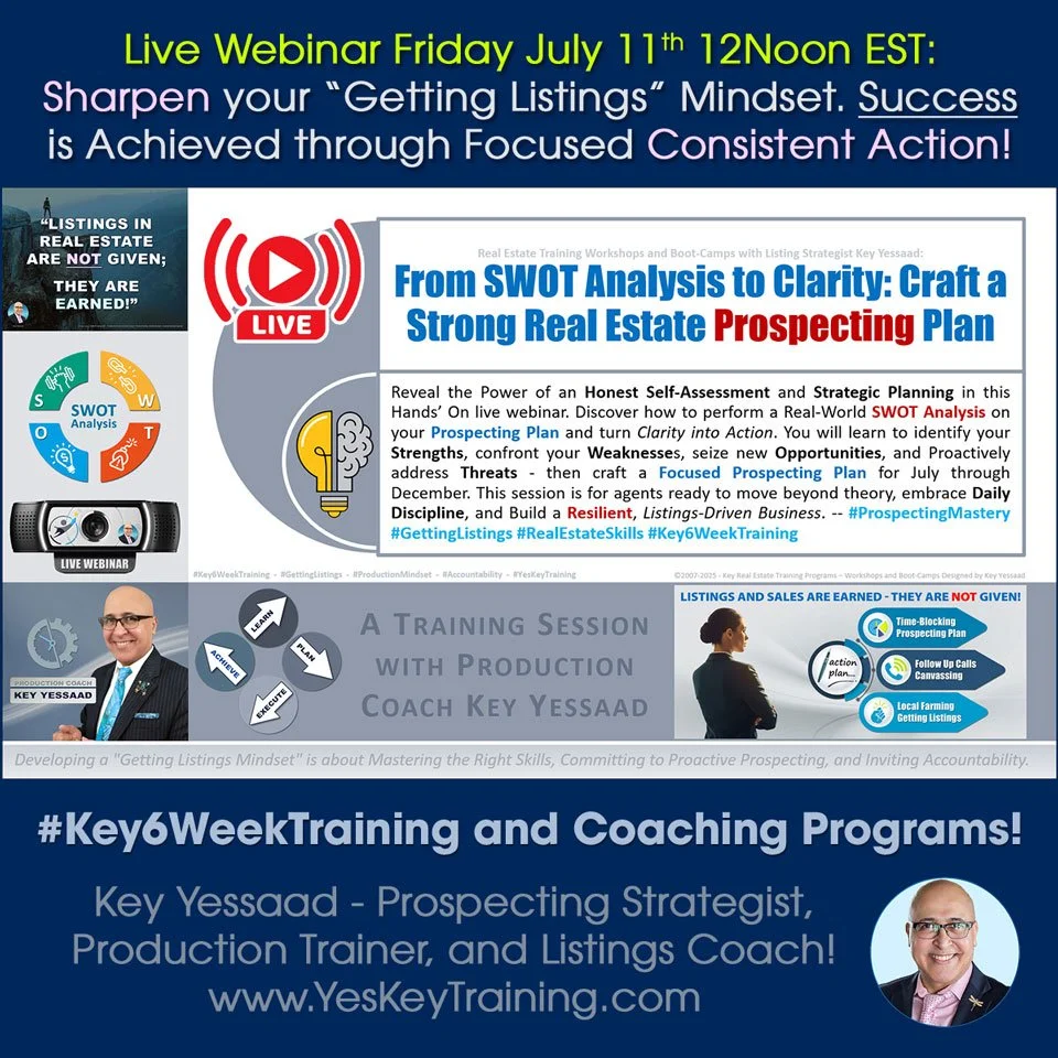 This rigorous 6-Week Training Program empowers Agents and Brokers to become Confident Prospectors of Listings through Daily Action and Proven Strategies. Designed for professionals ready to abandon the “order-taker” mindset, you will embrace Prospecting as a Non-Negotiable driver of success. Through structured training on Mindset, Scripts, Time-Blocking, and overcoming Canvassing Reluctance, you will develop the Courage to consistently generate leads and earn listings. This isn’t about theory – it is about Bold Action. Step up, take action, and become the agent sellers seek in today’s market. #ProspectingMastery #GettingListings #Key6WeekTraining
